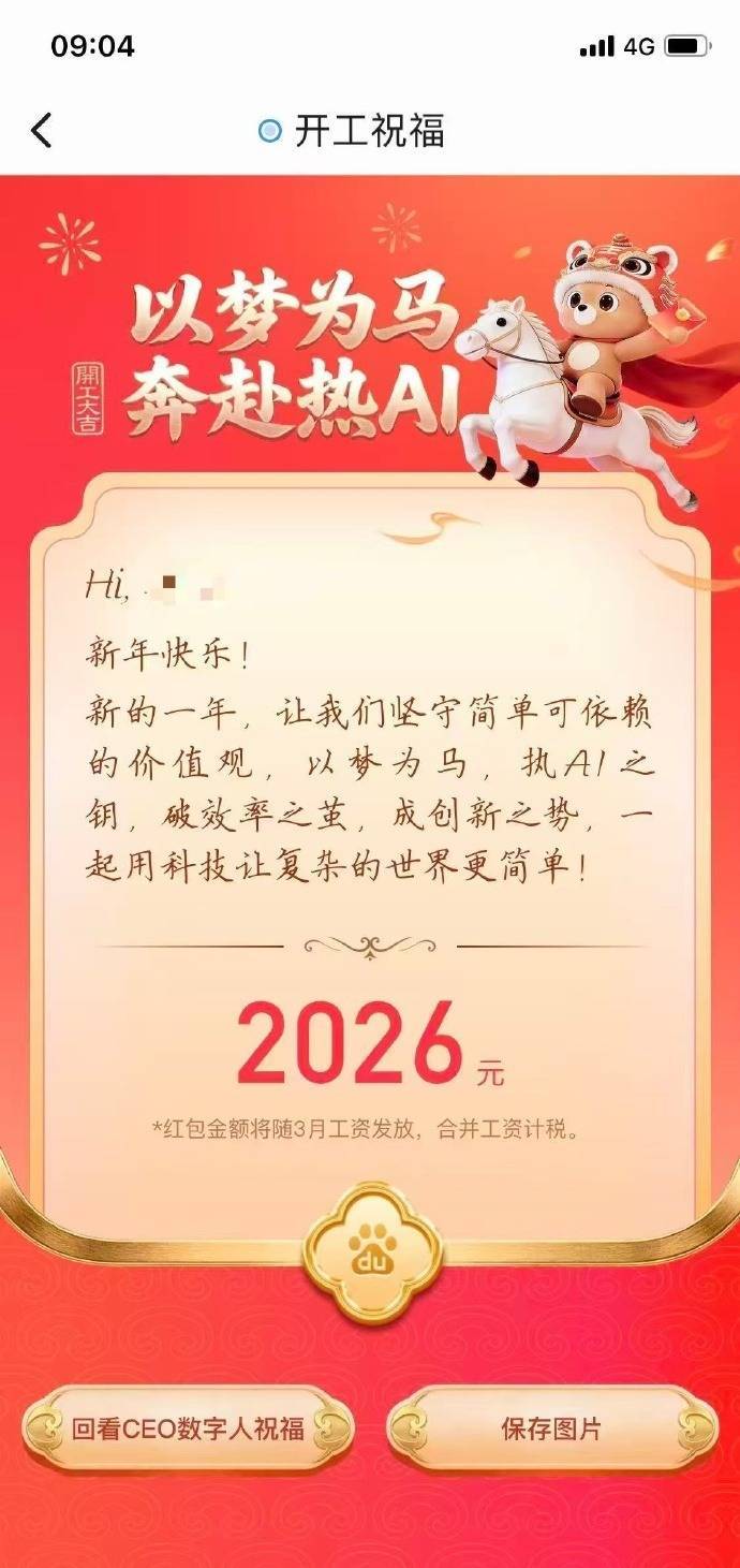 凤凰网科技讯 2月24日,据“大厂青年”爆料,李彦宏以数字人形式向百度员工发开工红包。据说每人至少365元,还有人晒出收到2026元红包的截图。