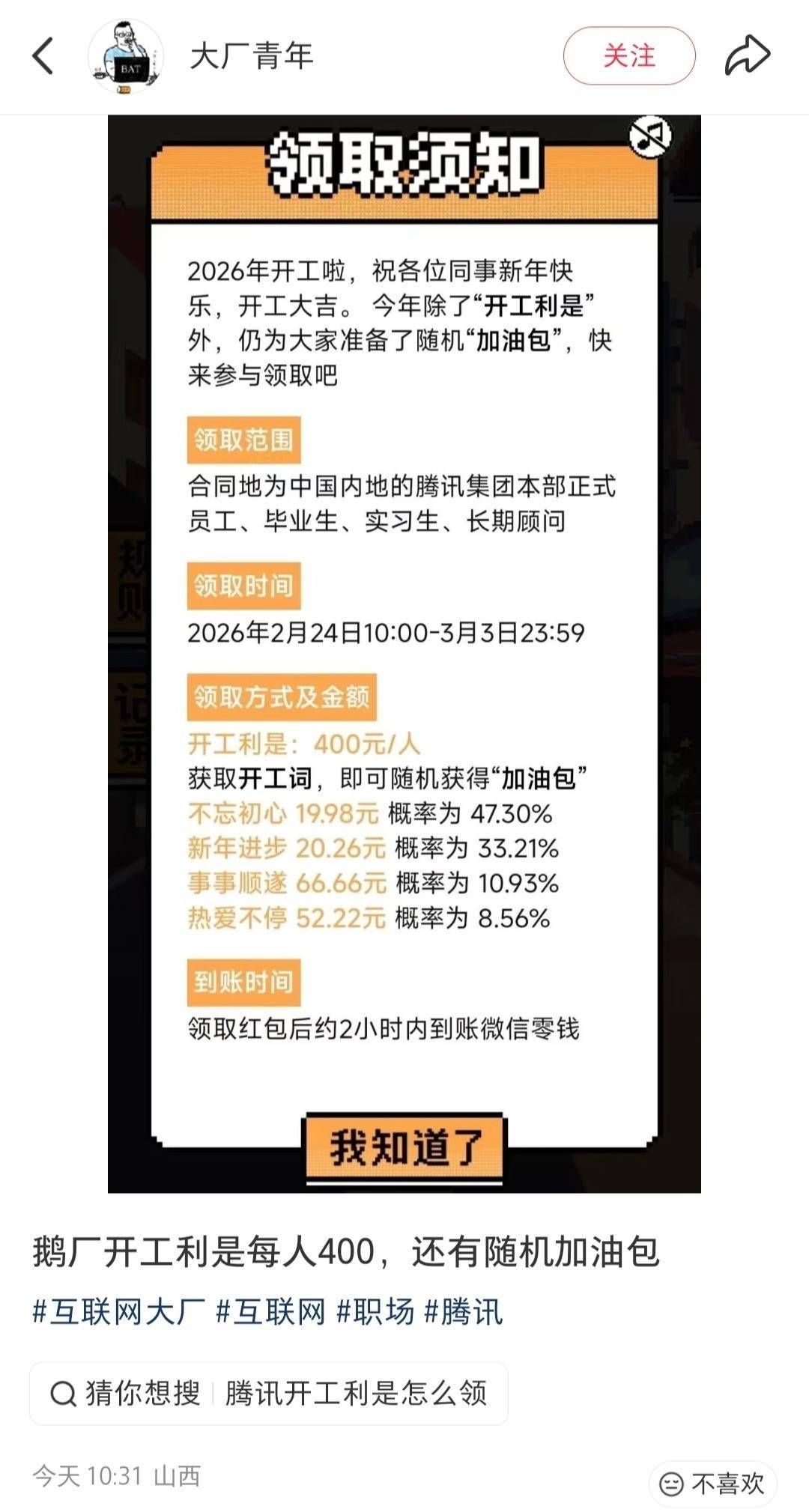腾讯今日也发布开工红包,每人400 元,还有19.98元~66.66元随机“加油包”。领取范围为合同地为中国内地的腾讯集团本部正式员工、毕业生、实习生和长期顾问。